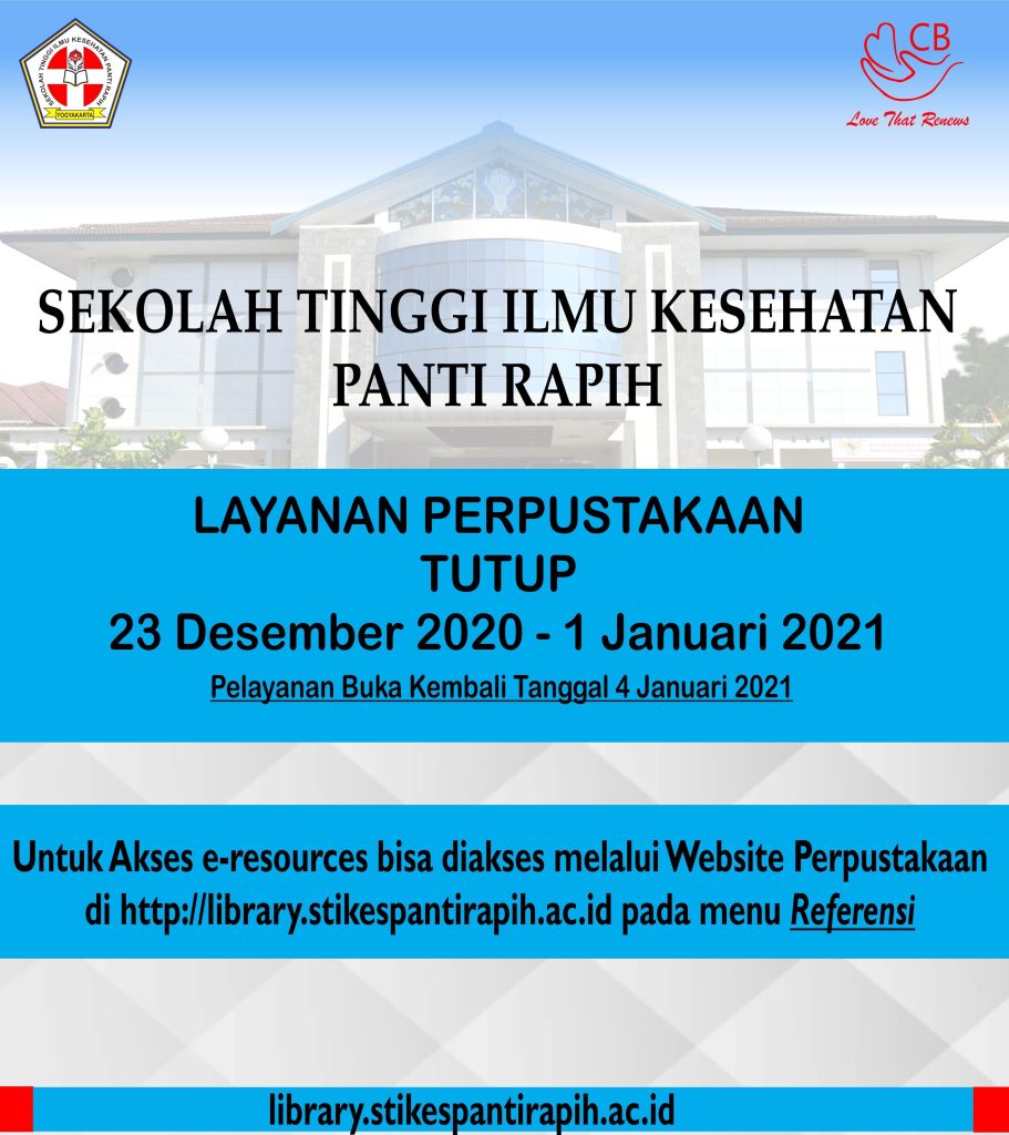 Sehubungan Dengan Adanya Libur Nasional Natal 2020, Maka Pelayanan Perpustakaan STIKes Panti Rapih Baik Kampus 1 maupun Kampus 2 Tutup dan Buka Kembali Senin , 4 Januari 2021.