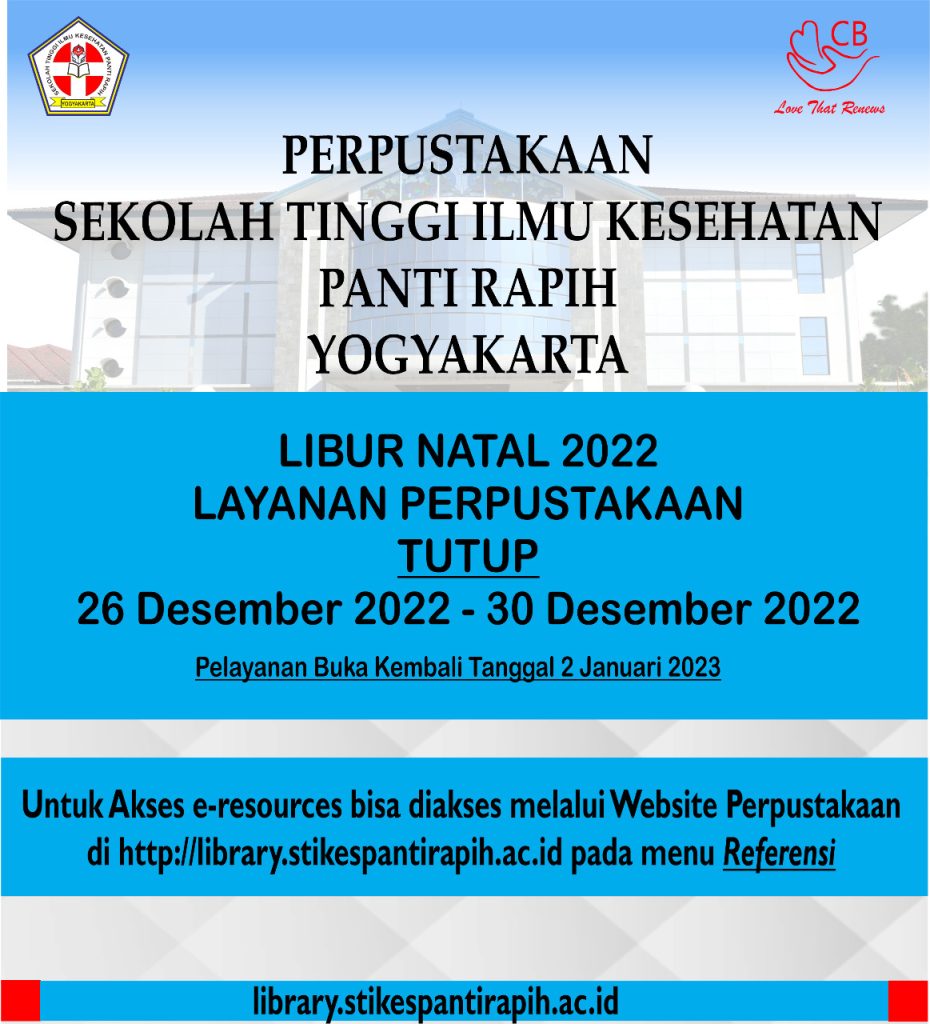 Sehubungan Dengan Adanya Libur Nasional Natal 2022 dan Tahun Baru 2023 Maka Pelayanan Perpustakaan STIKes Panti Rapih Tutup dan Buka Kembali Senin , 2 Januari 2023.